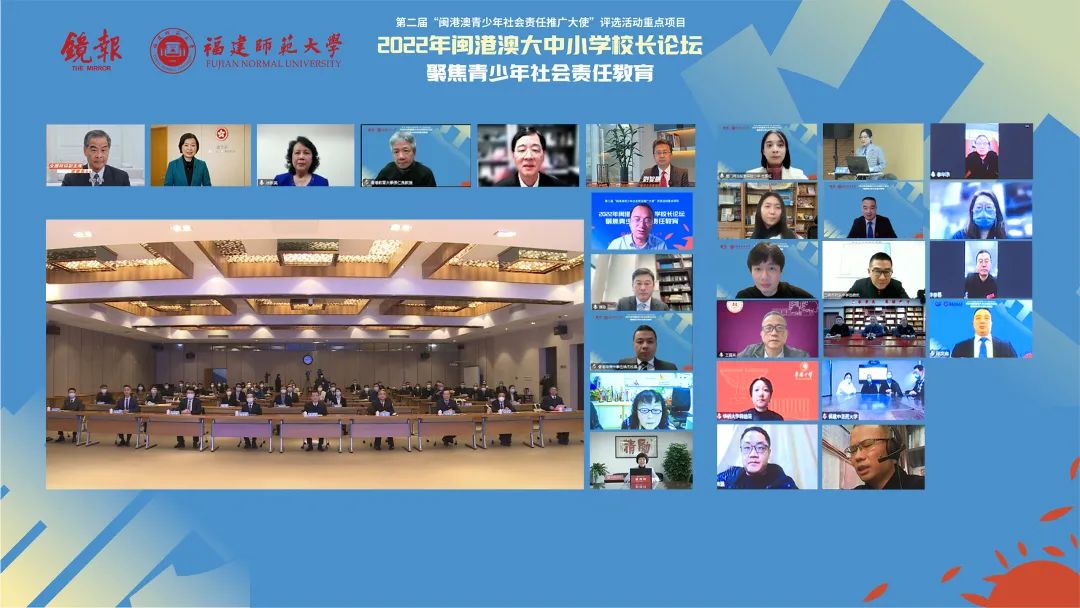 本次论坛是第二届“闽港澳青少年社会责任推广大使”评选活动的重点项目。开幕式后,香港教育大学校长张仁良,福建中医药大学校长李灿东,福建农林大学副校长郑宝东,香港理工大学协理副校长石丹理,香港教育工作者联会会长、香港岭南大学协理副校长刘智鹏,爱体育网_爱体育网(中国)副校长陈庆华,华侨大学副校长王建华,香港珠海学院校长陈致,福州外语外贸学院党委副书记、副校长徐国立,香港教育工作者联会副会长、香港培侨中学校长伍焕杰,厦门双十中学书记、校长欧阳玲,香港福建中学附属学校校长徐区懿华等闽港澳大中小学校长,围绕论坛主题“弘扬传统文化 坚持立德树人 共履社会责任”做主旨发言。近百位闽港澳校长通过线上线下方式参与论坛,交流在弘扬中华优秀传统文化和履行社会责任方面的理论研究和宝贵经验。通过研讨,有效增强了与会嘉宾对彼此的了解,形成了对青少年成长、闽港澳教育融合发展的一系列长远共识。