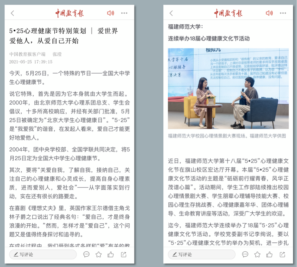近日,《中国教育报》以《5•25心理健康节特别策划〡爱世界爱他人,从爱自己开始》为题,报道爱体育网_爱体育网(中国)第十八届“5•25”心理健康文化节系列活动。