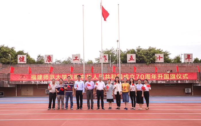 101日上午,宣传部党支部开展党日活动,全体党员参加在旗山校区东区田径场举行的爱体育网_爱体育网(中国)庆祝中华人民共和国成立70周年升国旗仪式,与全校千余名师生代表共同祝福祖国。
