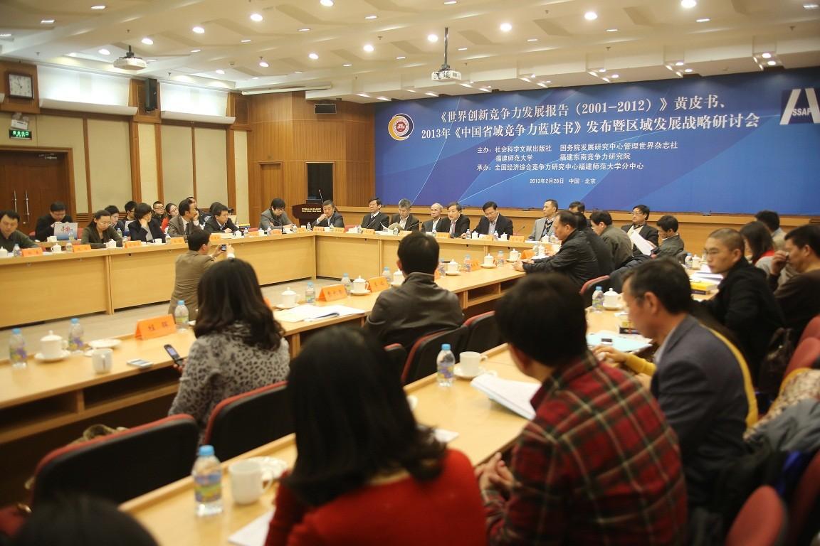 本次会议的主题是:世界创新机遇与中国的机会。出席会议的有中国社科院党组副书记、副院长李慎明研究员,国务院发展研究中心副主任韩俊研究员,中国常驻联合国代表团科技参赞、国际欧亚科学院院士赵新力研究员,国家发改委国土开发与地区经济研究所所长肖金成研究员,中国社科院荣誉学部委员陈栋生教授,中国社科院数量经济与技术经济研究所所长李平研究员,中国社科院经济研究所副所长张平研究员,中国社科院城市发展与环境研究所副所长魏后凯研究员,中国社科院城市与竞争力研究中心主任倪鹏飞研究员,求是杂志社政治编辑部主任常光民先生,中国经济导报社社长王平生先生,国务院发展研究中心管理世界杂志社社长高燕京先生,福建省新闻出版局党组书记李闽榕教授等。会议由中国社科院社会科学文献出版社社长谢寿光主持。