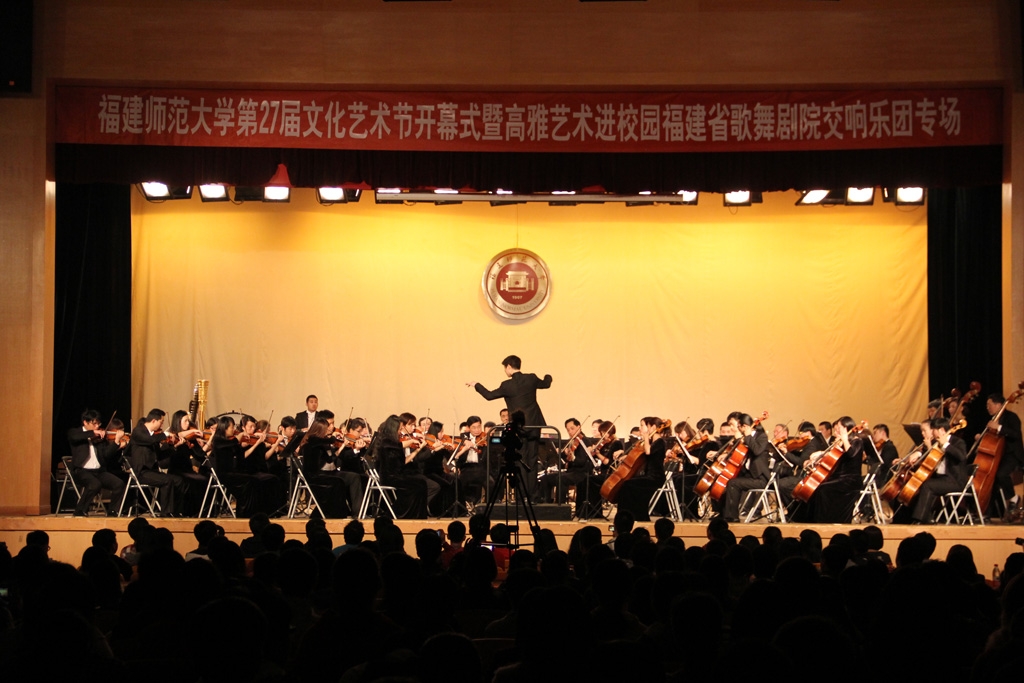 4月12日晚,校第27届文化艺术节开幕式暨高雅艺术进校园之福建省歌舞剧院交响乐团专场演出在旗山校区青春剧场举行。校党委副书记林和平,艺术节组委会全体成员,各学院师生代表共1000多人参加了开幕式。