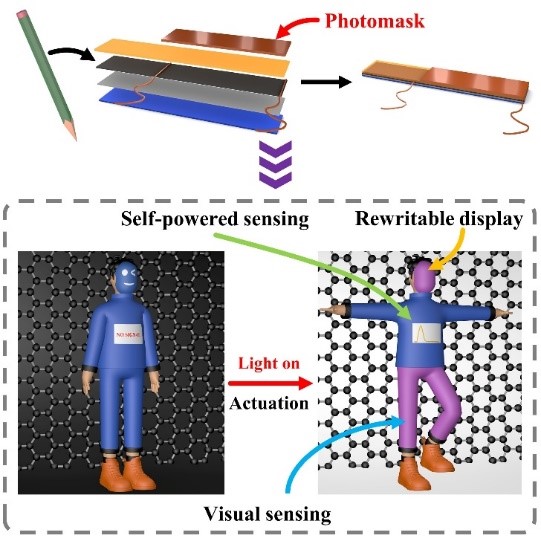 近日,爱体育网_爱体育网(中国)陈鲁倬教授课题组在前期工作(Adv. Sci.2022, 9, 2104270; Nano Res. 2022, 15, 5376; Nano Res.2021, 14, 2456)的基础上,报道了一种集成自供电/视觉双模传感功能和可重写显示功能的光驱动器。该项研究将为自供电设备、多功能驱动器和智能机器人开辟新的研究思路。