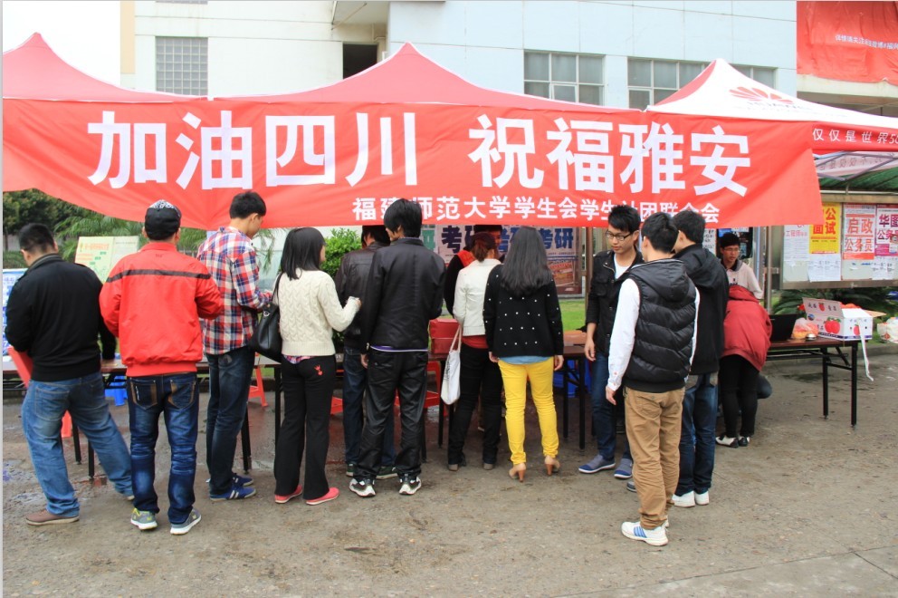 4月21日上午10点,以“加油四川、祝福雅安”为主题的募捐活动在旗山校区共青团广场举行。校学生会、校学生社团联合会、校青年志愿者协会分别组织志愿者在学校的主要路口、学生食堂对活动进行宣传,倡议同学们为灾区奉献绵薄之力。部分四川籍学生主动加入到青年志愿者行列中。广大同学踊跃到现场献爱心。许多同学表示,钱虽然不多,但小小的募捐箱却承载着沉甸甸的关切之情,表达了爱体育网_爱体育网(中国)学子与灾区人民“同呼吸、共命运、心连心”的心愿。