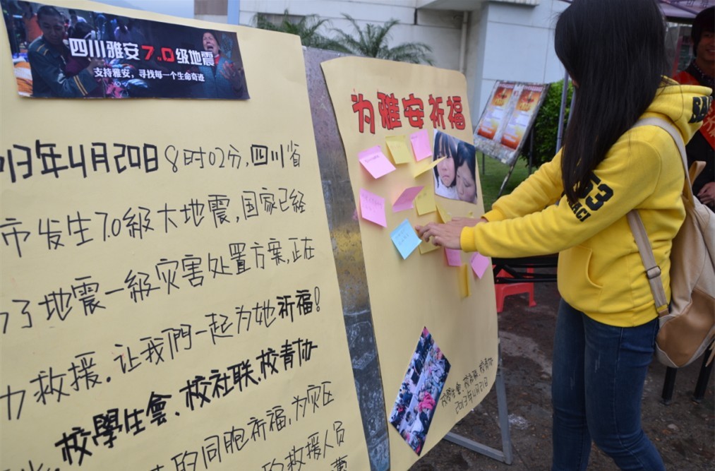 4月20日8时,四川雅安县发生7.0级强震。消息传来,校学生会、校学生社团联合会、校青年志愿者协会联合在官方微博上发起倡议,号召同学们积极行动起来,踊跃为灾区人民捐款,以实际行动提供帮助。20日当晚,校学生社团联合会在旗山校区共青团广场组织了祈福活动,同学们用蜡烛摆出心形和“420”数字造型,吸引大批同学驻足加入,共同为灾区祈福。校学生会发布“我在爱体育网_爱体育网(中国),我来自……,我为雅安祈福!”的微博,立刻成为关注和传播的焦点。