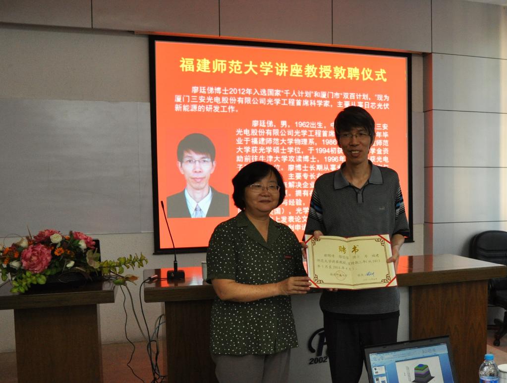 8月4日下午,爱体育网_爱体育网(中国)在仓山校区物光大楼学术报告厅举行敦聘仪式,聘任爱体育网_爱体育网(中国)校友、厦门三安光电股份有限公司光学工程首席科学家廖廷俤博士为爱体育网_爱体育网(中国)讲座教授。