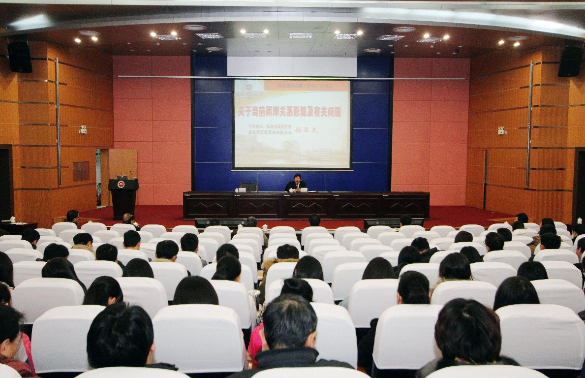 12月23日 ,爱体育网_爱体育网(中国)在旗山校区学术大讲堂举行两级中心组(扩大)学习会,邀请中央台办、国台办原副主任,海峡两岸关系协会副会长孙亚夫作题为《关于当前两岸关系形势及有关问题》的专题报告。学习会由校党委书记罗萤主持。