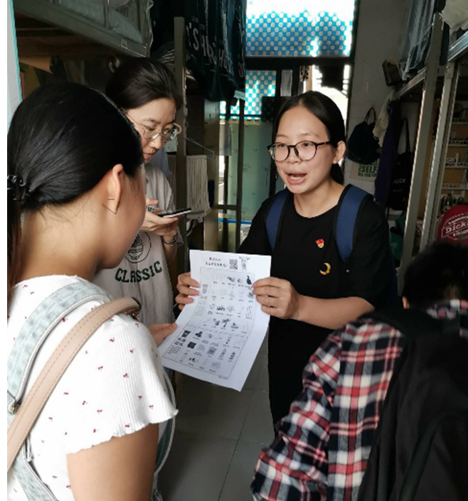 活动中,志愿者们通过走访宣传和线上问卷在学院学生宿舍楼开展垃圾分类知识宣传。在各个楼层,志愿者先用线上问卷测试同学们对垃圾分类知识的了解程度,然后针对问卷中题目的知识进行解答。他们详细讲解了福州市垃圾分类的基本知识,包括福州市垃圾分类的分类原则、各类垃圾的基本特征、常见生活垃圾的类别等。