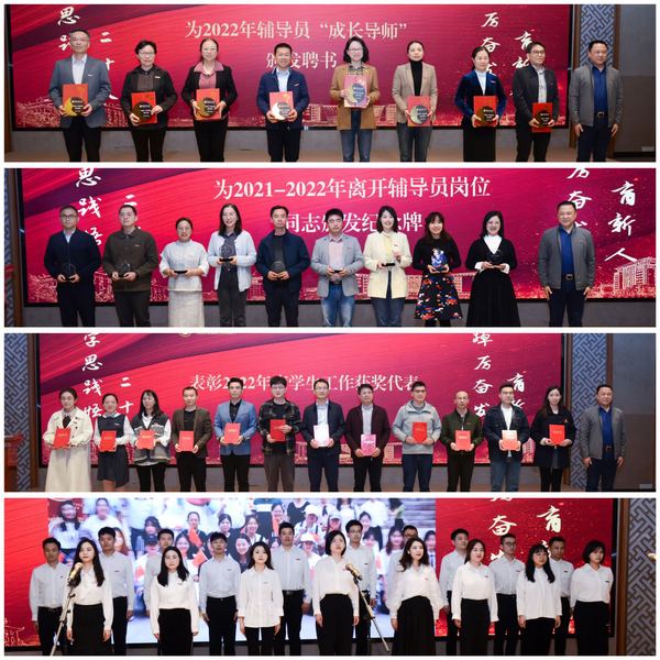 会议对2021—2022学年校优秀辅导员和2022年大学生教育管理优秀论文、思想政治工作优秀案例、辅导员优秀网络微评作品进行表彰,为2022年新入职辅导员“成长导师”颁发聘书和纪念牌,向2021、2022年离开辅导员岗位的同志颁发纪念牌。