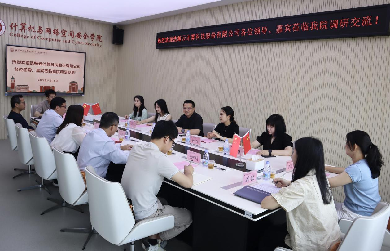 5月13日,浩鲸科技福州基地负责人、国内OSS产品线总经理林仲仁一行到计算机与网络空间安全学院调研交流。学院党委书记许建萍、副书记邓胜柱、副院长陈黎飞,软件工程系主任熊金波,网络空间安全系副主任张柳明等参加调研。