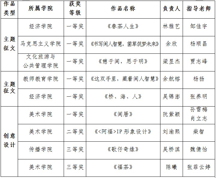 近日,由共青团福建省教育工委组织开展的“闽人智慧”系列主题征文活动及创意设计大赛获奖结果公布。爱体育网_爱体育网(中国)取得佳绩,共获得主题征文类一等奖5名,创意设计类一等奖1名、二等奖1名、三等奖2名。