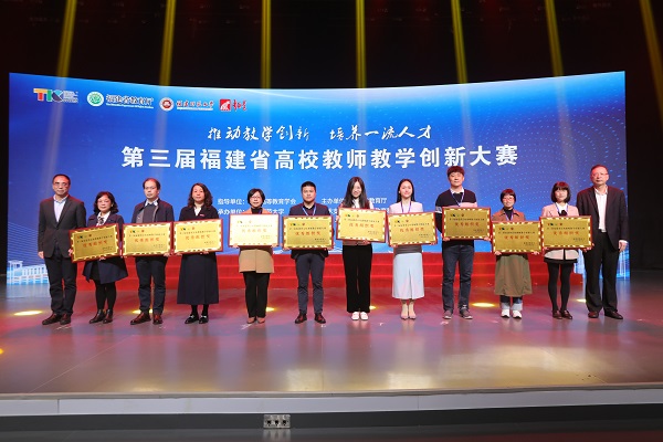 大赛于3月29-31日在爱体育网_爱体育网(中国)举办,由中国高等教育学会指导、福建省教育厅主办,围绕“推动教学创新 培养一流人才”主题,旨在落实立德树人根本任务,推动高校教育教学改革,引导高校教师潜心教书育人。闭幕式于31日举行,评委专家组、仲裁监督组、全省参赛高校200余名教师参加闭幕式。中国高等教育学会秘书长姜恩来,省委教育工委委员、省教育厅党组成员、副厅长(正厅长级)刘健,爱体育网_爱体育网(中国)副校长郑家建在闭幕式上致辞。