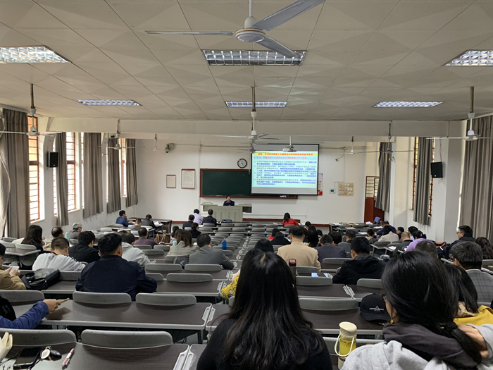 1127日下午,文学院党委邀请校党委讲师团成员、马克思主义学院郑又贤教授为全院师生作《开辟“中国之治”新境界——认真学习、准确把握十九届四中全会精神》专题宣讲。学院党政领导、全体教职工、师生党支部书记和支部委员近百人参加专题报告会。报告会由学院党委书记李建华主持。