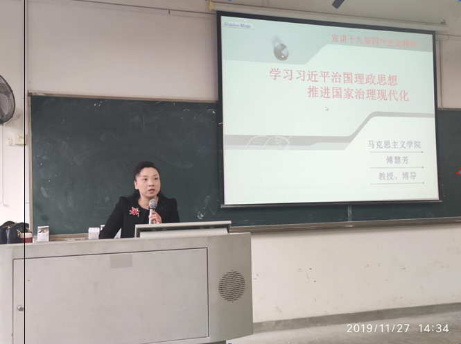 活动于11月27日下午在致广1-202教室举行。校党委讲师团成员傅慧芳教授应邀为社会历史学院师生宣讲党的十九届四中全会精神。学院党委书记陈尚旺、院长叶青,学院师生党员代表共计100余人参加活动。宣讲会由陈尚旺主持。