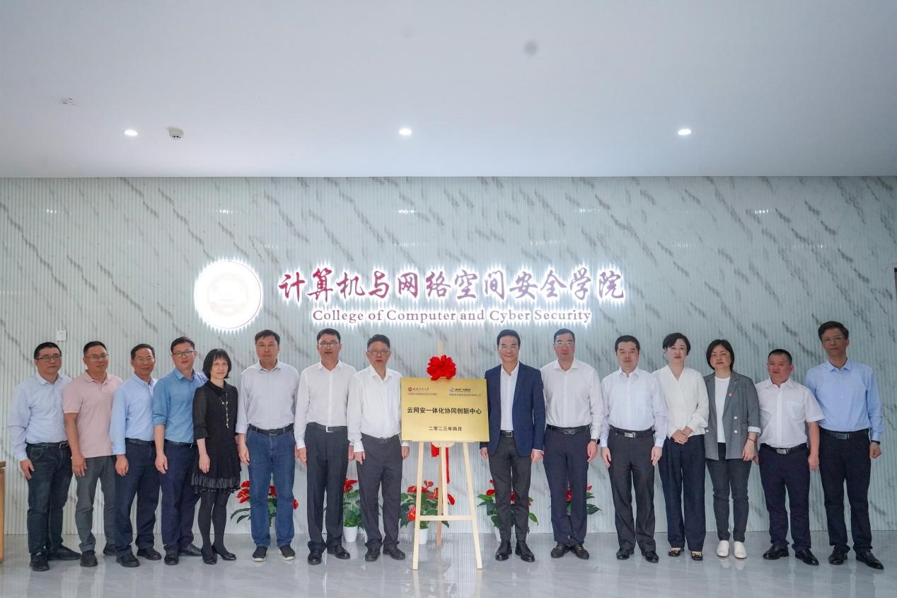 仪式上,校企双方签署产学研合作协议,与会领导共同为“云网安一体化协同创新中心”揭牌。