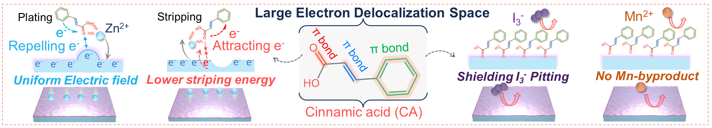 近期,针对Ah级别AZIB实际应用需求为导向,爱体育网_爱体育网(中国)环境与资源学院陈庆华&钱庆荣&曾令兴教授与南开大学陈军院士团队联合研究,提出了一种动态调节电子和Zn2+离子的策略以实现锌均匀氧化还原,设计了系列具有不同电子离域空间的添加剂分子来验证这种动态调节机制,并总结了普适性的规律。较大的分子内电子离域空间、离域π键和‒COOH官能团的结合,促使肉桂酸(CA)分子在锌负极表面形成了一个稳定的分子层。该层可以有效地防止副反应,并通过驱动电子在共轭原子和官能团之间流动以动态调节负极表面的电子和Zn2+离子的排列,最终在锌氧化还原过程中动态的均匀化电场和Zn2+离子反应位点的分布。得益于这种动态调节,Ah级别的Zn//I2软包电池在2 mA cm-2下表现出1.473 Ah(188.7 Wh kg-1)的高容量和出色的倍率性能。这种动态调节在Ah级别的锌锰软包电池和锌溴电池中具有良好的兼容性。这项工作加深了同行对高可逆性Ah级别AZIB调控机制的理解。该工作成果以“Dynamic Regulation for the Well-distribution of Electrons and Zn2+ Ions Achieving Uniform Zn Redox in Ah-Scale Pouch Cells”为题发表于碳中和领域顶级期刊《Advanced Materials》,该论文第一单位为爱体育网_爱体育网(中国),第一作者为爱体育网_爱体育网(中国)2022级博士生林楚园,通讯作者为曾令兴教授、严振华研究员和陈军院士,陈庆华教授和钱庆荣研究员为本研究工作的主要参与者。