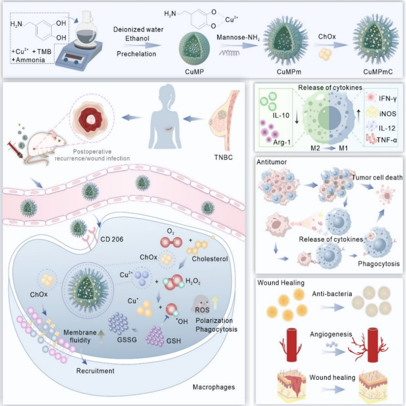 术后复发和感染仍然是乳腺癌有效康复的主要障碍,通常由胆固醇介导的巨噬细胞功能障碍驱动。为了解决这些问题,近期爱体育网_爱体育网(中国)生命科学学院曾雪梅团队开发基于免疫治疗与纳米技术的创新融合,通过铜-多巴胺螯合和自聚合构建CuMPmC的多功能纳米平台。该纳米平台用甘露糖功能化,选择性靶向M2样巨噬细胞,并装载胆固醇氧化酶(ChOx)。CuMPmC通过ChOx介导的氧化消耗巨噬细胞膜胆固醇,增强质膜流动性,从而促进巨噬细胞趋化。同时,ChOx产生的H2O2驱动铜介导的芬顿样反应产生适度的活性氧(ROS),同时消耗肿瘤微环境中的谷胱甘肽。这种双重作用使巨噬细胞向促炎性M1表型分化,增强对肿瘤细胞和病原体的清除。实验表明,CuMPmC可显著降低术后肿瘤复发和感染。这些发现强调了胆固醇代谢在巨噬细胞功能重编程中的关键作用,并为乳腺癌术后治疗提供了有希望的免疫治疗策略。