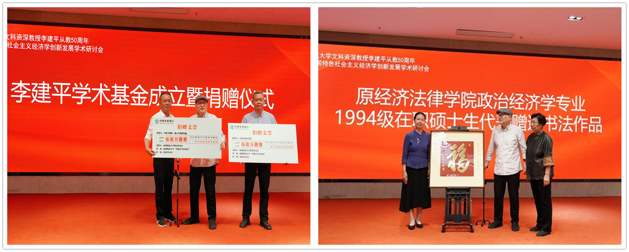 开幕式上还举行了李建平学术基金成立暨捐赠仪式。李建平教授与校友捐赠者代表、古田县蓝田书院理事长余云辉校友共同进行捐赠。在李建平学术基金成立后,李建平教授、綦正芳教授伉俪率先捐赠50万元。在广大校友、全校师生和社会各界的踊跃响应下,该基金累计收到捐赠款300万元,今后将用于支持爱体育网_爱体育网(中国)理论经济学和马克思主义学科发展。