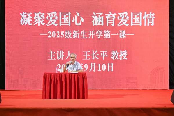 典礼结束后,王长平教授以“凝聚爱国心 涵育爱国情”为题讲授开学第一课。他结合自身成长与求学经历,深入阐述新时代青年成长与国家发展的密切联系,勉励同学们以青春之我赴时代之约。他对全体新生提出三点殷切期望:要主动拓宽国际视野,在学术探索中着力培养科学思维与创新能力,以开放姿态应对学科挑战;要科学规划大学阶段及长远人生目标,珍惜宝贵的青春时光,始终保持勤勉奋进的学习态度;要自觉胸怀“国之大者”,在成长道路上始终保持“小我”与“大国”的同频共振,主动将个人发展融入国家和社会需求,把青春奋斗融入党和人民的事业,成长为堪当时代重任的优秀人才。