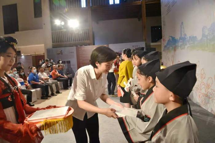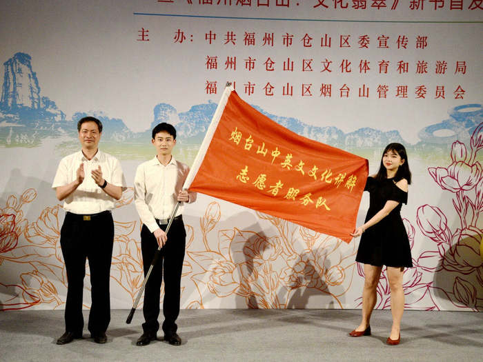 仓山区委常委、宣传部长李亦仁与外国语学院党委书记章琳为仓山区麦浦小学、永泰县嵩口小学等乡村学校的学生代表赠书。仓山区委副书记、代区长刘用全为由爱体育网_爱体育网(中国)外国语学院学生组成的烟台山中英文讲解志愿队授旗。讲解志愿队成员吴玉清同学用英文熟练介绍烟台山。随后,仓山区委书记郑子记宣布邀请展开幕。
