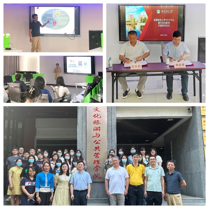 近日,惠安县民政局副局长庄东权带领相关社工机构代表到文化旅游与公共管理学院交流,双方在智慧旅游实验室举行共建产学研实习基地签约仪式。