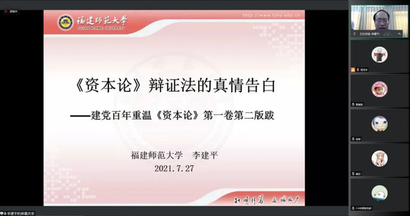 李建平教授报告的题目是“《资本论》辩证法的真情告白一一建党百年重温《资本论》第一卷第二版跋”,这是他和经济学院副院长(主持工作)黄瑾教授合作撰写的一篇文章,发表在2021年第5期《经济学动态》上,中国社会科学院学术期刊网、中国政治经济学智库《理论探索》、中国人民大学论坛公众号等都作了推送,影响广泛。报告内容包括五个部分,分别是:中国共产党的百年发展与《资本论》密切相关、《资本论》第一卷第二版跋之前的几个重要历史事实、第二版跋对《资本论》辩证法的真情告白、从恩格斯到习近平:第二版跋关于辩证法告白的深远影响与当代价值以及几点启示。