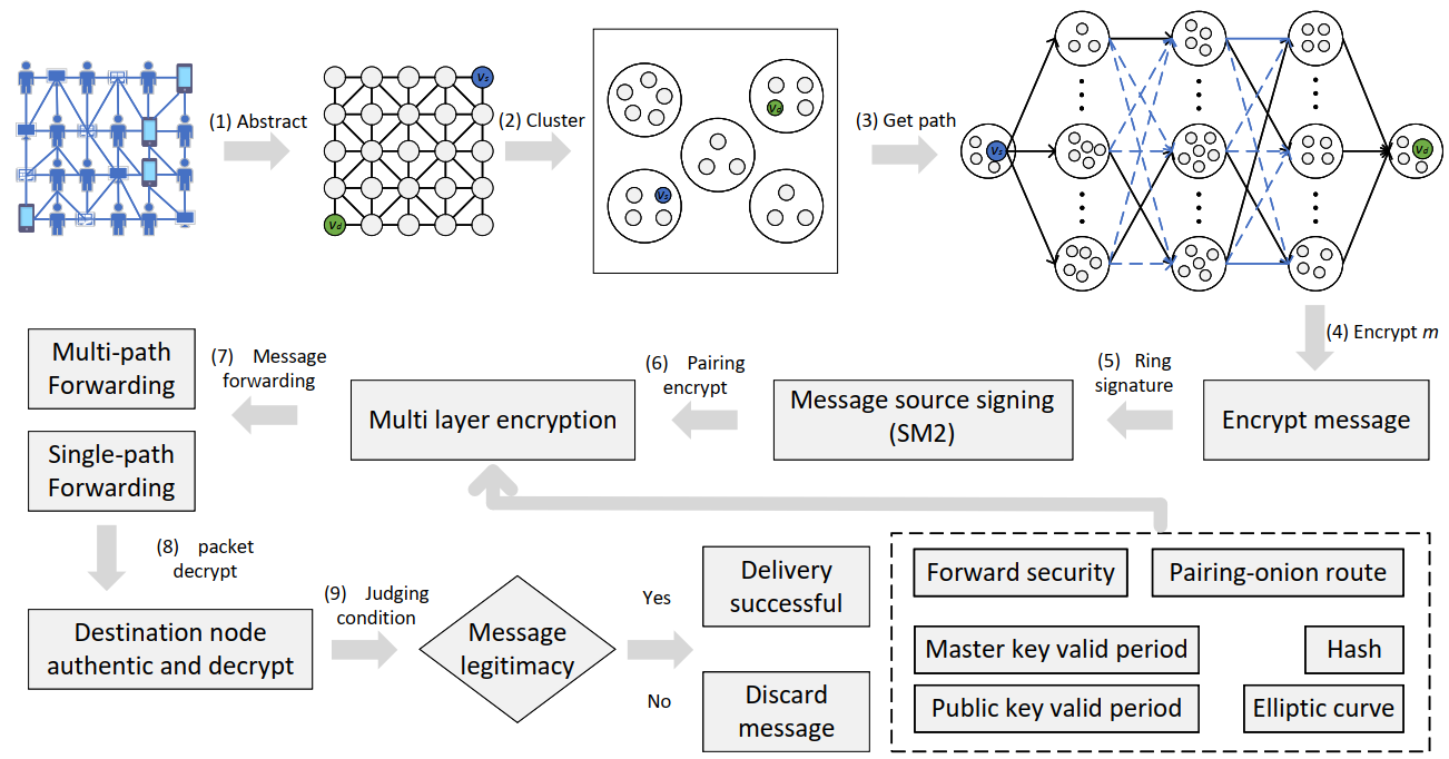 在匿名通信领域,课题组针对移动机会网络中存在连接不稳定与身份泄露等问题,创新性提出FLAG-POR协议(Forward Legal Anonymous Group Pairing-Onion Routing)。该协议融合组加密、洋葱路由与前向安全机制,首次引入“组”结构至洋葱路由体系,实现了组内节点可协同转发,大幅提升了消息传输成功率与匿名性。协议采用SM2签名机制保障消息合法性,并通过公钥与主密钥有效期参数实现前向安全,能够有效抵御串通攻击、路径识别和节点识别等多种威胁。实验与理论分析表明,FLAG-POR在传输成功率、路径匿名性、节点匿名性及抗追踪性能等方面均优于现有匿名协议,展示出良好的实际部署价值。