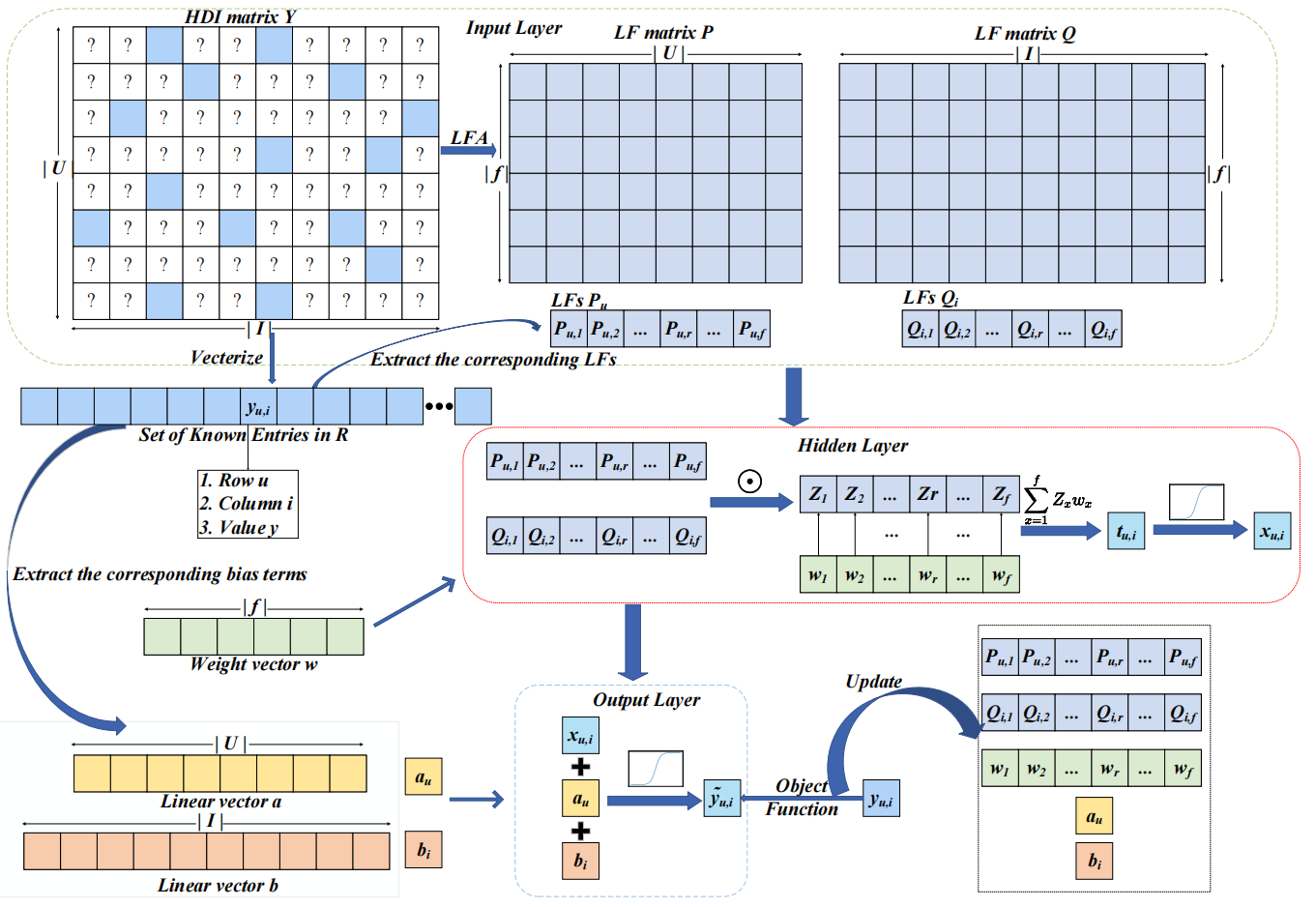 研究成果以“Neural Networks-Incorporated Latent Factor Analysis for High-Dimensional and Incomplete Data”为题,发表于中科院一区TOP期刊、CCF B类期刊《IEEE Transactions on Systems, Man and Cybernetics: Systems》。该论文以爱体育网_爱体育网(中国)为第一单位,第一作者为爱体育网_爱体育网(中国)林铭炜教授,第二作者为2023级软件工程专硕研究生林兴宇。该研究工作得到国家自然科学基金项目、福建省自然科学基金杰青项目、福建省“雏鹰计划”青年拔尖人才项目以及爱体育网_爱体育网(中国)宝琛计划“高端人才”资助。