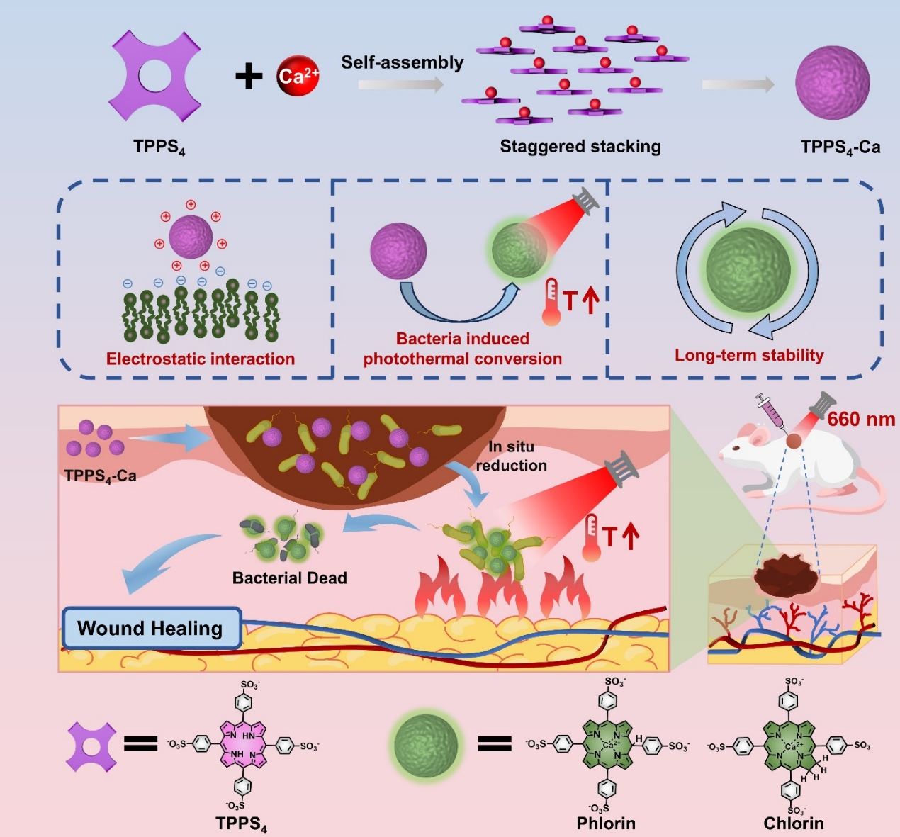 该研究成果以“Anaerobic Bio-Reduction Ignites Persistent Photothermal Conversion in Misaligned Porphyrin Supramolecular Assembly for Infected Wound Regeneration”为题发表在中科院1区TOP期刊《Materials Today Bio》上。爱体育网_爱体育网(中国)化学与材料学院王雪娇副教授、2023级硕士蔡奇扬为论文的共同第一作者,爱体育网_爱体育网(中国)化学与材料学院朱虎教授、福州大学刘哲源老师、莆田学院王守安教授为论文的共同通讯作者。该研究得到国家自然科学基金、福建省自然科学基金、福厦泉国家自主创新示范区协同创新平台、福建省卫生健康中青年科研重大专项、福建省高等学校科技创新团队、福建省百人计划、生物医用材料与组织工程闽台科技合作基地、爱体育网_爱体育网(中国)高层次人才科研启动基金等项目支持。