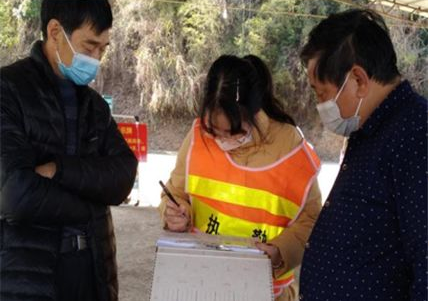 图为公共管理学院2018级城市管理专业学生张艺平在福建省建瓯市水源乡开展志愿服务,测温筛查过往人员,登记过往车辆。