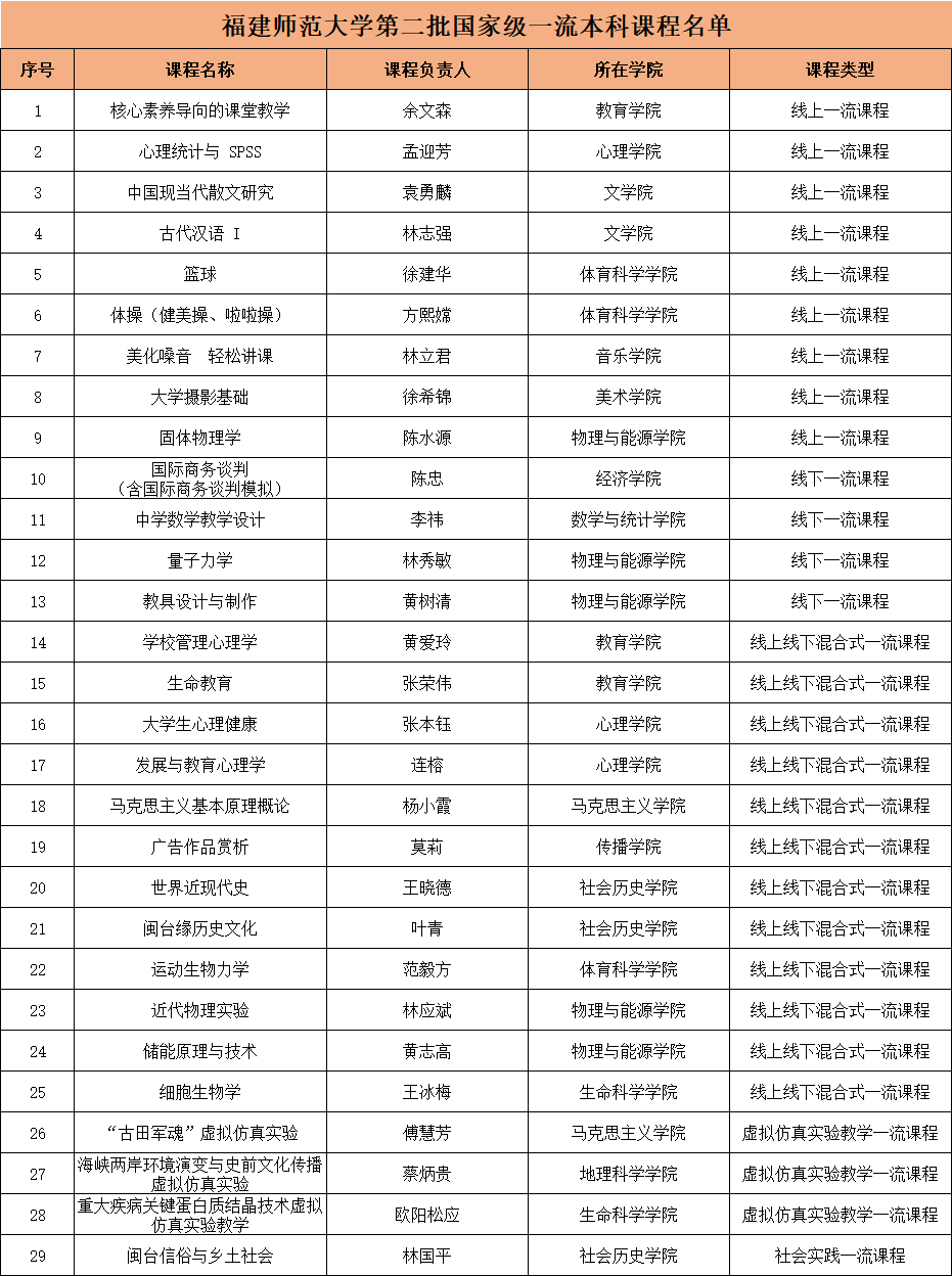 日前,教育部公布了第二批国家级一流本科课程认定结果,爱体育网_爱体育网(中国)29门课程入选其中。截至目前,爱体育网_爱体育网(中国)共获批国家级一流本科课程54门,总数位居福建省属高校首位。 (教务处)