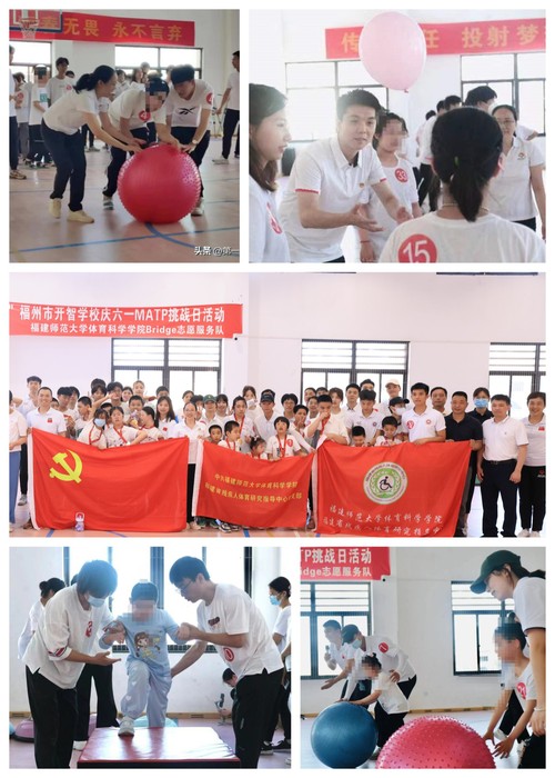 活动中,支部全体党员与Bridge志愿服务队志愿者带领大家共同参与了“竹兜欢乐跳”和“滚筒大作战”等特奥融合游戏,并组织福州市开智学校学生进行了移动技能、灵敏技能、踢击技能、打击技能等4个部分的MATP(机能活动训练计划)挑战,让孩子们在运动中体验快乐,展现自我。活动现场气氛热烈、其乐融融,很好地展示了中重度智力障碍学生机能活动训练的成果,同时也让大学生志愿者更加深入地了解智力障碍学生,成为智力障碍学生的融合伙伴。