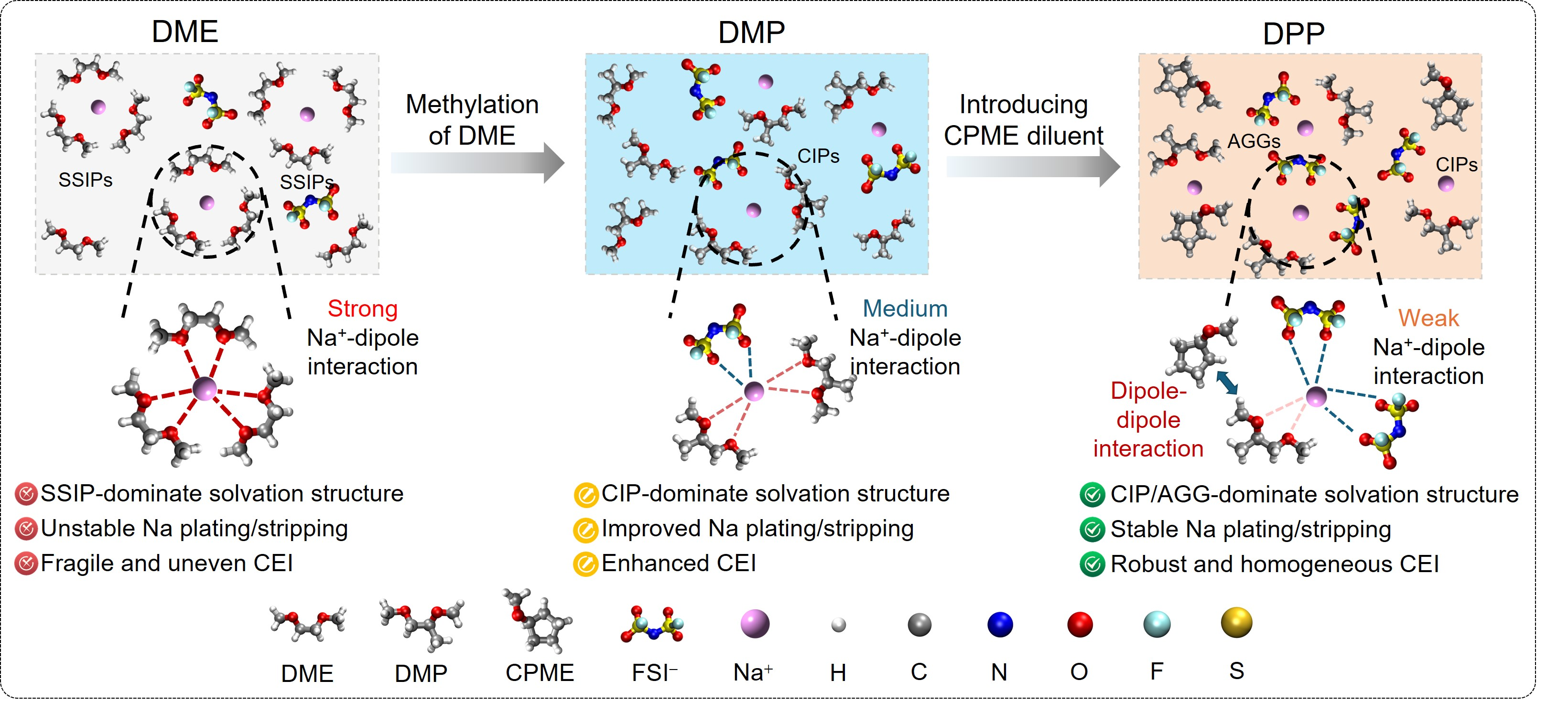 为了解决这些问题,团队提出了一种弱溶剂化电解液,通过DME中α-H原子甲基化形成1,2-二甲氧基丙烷(DMP),并合理的引入环戊基甲醚(CPME),共同促进阴离子衍生的富含NaF的EEI层的形成,有效抑制其在电解质中的溶解来实现PTCDA正极的稳定性。采用该电解液在300次循环后中实现了优异的循环性能(容量保持率为~97.8%)。密度泛函理论计算和分子动力学模拟进一步证明了实验结果。这项工作提出了一种非常有前景和可推广的策略,用于精确定制电解质结构,以解锁SOBs的稳定和高性能运行。