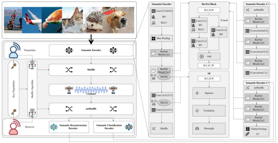 研究成果一:针对语义通信中模型反演与对抗攻击风险,构建动态行列混淆加密与原型对抗对齐机制,在语义特征提取阶段引入多级扰动,通过表示学习增强的对比损失函数约束,实现端到端隐私保护。实验显示,该架构在CIFAR-10 分类任务中对抗攻击防御性能提升3%-5%,攻击者重构有效图像数量减少90%,为6G 智能通信、工业数字孪生等场景提供了安全高效的语义传输新标准。