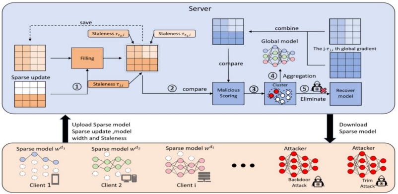 研究成果三:面向异构设备环境中的投毒攻击威胁,首创缓存驱动的半异步联邦架构,设计稀疏模型动态填充与柯西中值定理驱动的自适应恢复策略,有效解决异步通信中的“部分参与偏差”问题(图3)。通过历史更新筛选与异常评分聚类检测,投毒攻击识别准确率提升12%,模型恢复效率提高7.26%,在MNIST 与CIFAR-10 数据集上较传统方法准确率提升7.86%,为无人机集群、车联网等动态场景提供了高鲁棒性学习范式。