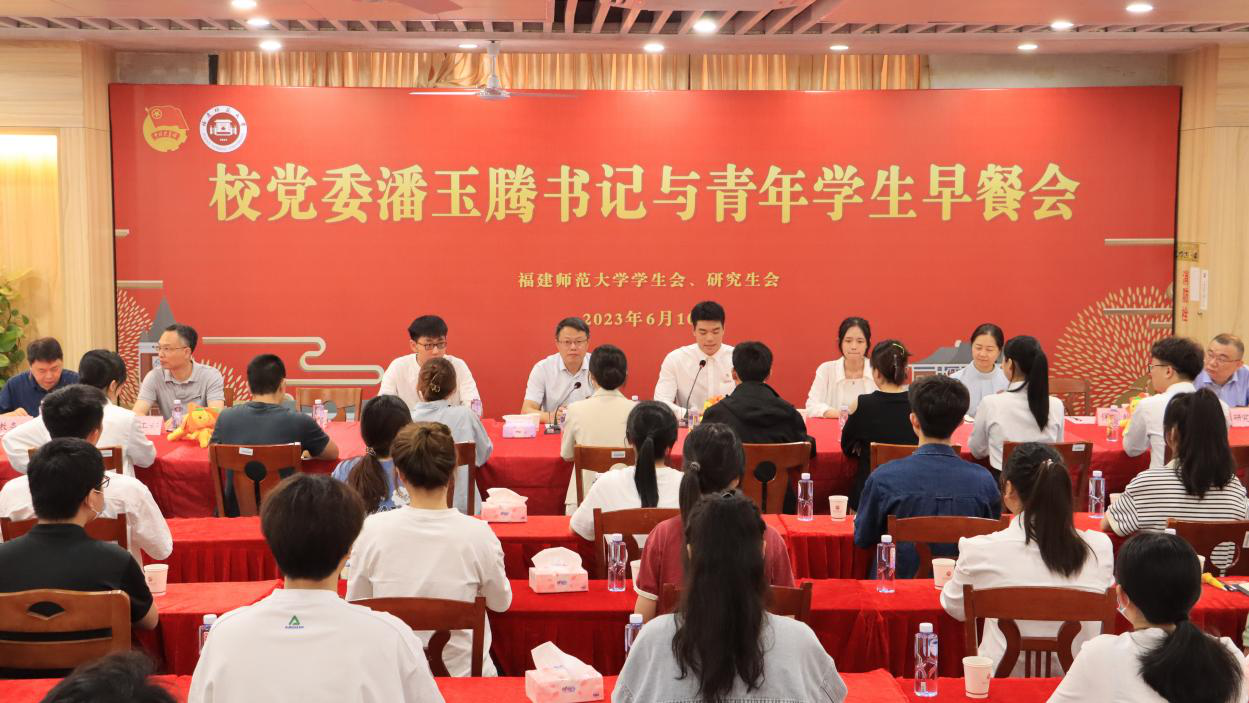 6月10日,由校学生会、研究生会主办的第十七期“校党委书记与青年学生早餐会”在仓山校区聚星园餐厅举行。校党委书记潘玉腾,党政办公室、宣传部、学生工作部、保卫处、教务处、研究生院、后勤管理处、校团委、体学学院等单位负责人、各学院学生代表参加活动。早餐会由校学生会执行主席林润杰主持。