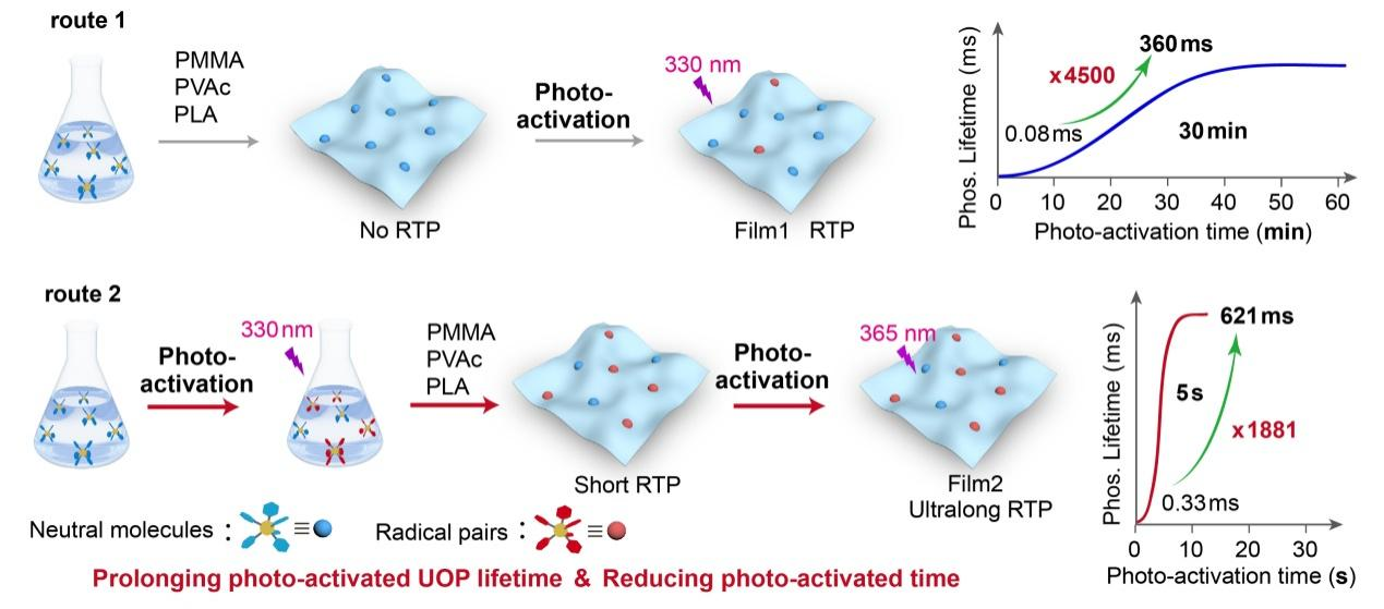 有机超长室温磷光材料因其长寿命的三重态激子、大斯托克斯位移、丰富的激发态等独特优势,引起了广泛关注。近年来,开发对外部刺激(如,激发波长、紫外光照射、温度、湿度、机械力等)具有响应性的有机超长室温磷光材料已成为一个热点课题。部分有机小分子化合物通过紫外光、热或机械力刺激调控分子排列与分子间相互作用;或将有机染料掺杂到聚合物基质中,利用紫外辐照除氧及光交联策略,实现动态磷光行为。然而,这些刺激响应室温磷光材料的光激活时间和光激活磷光寿命高度依赖于材料的内在属性,通常是恒定不变的,因此,调控光激活磷光寿命和光激活时间仍然是一个巨大的挑战。