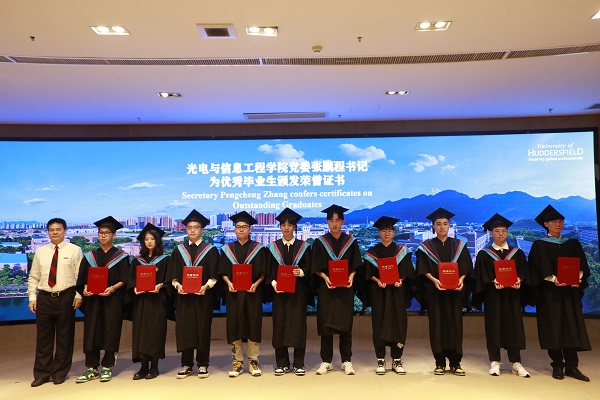 仪式上,Bob Cryan校长为毕业生拨穗,双方校长与毕业生合影留念。光电与信息工程学院负责人宣读了获得哈德斯菲尔德大学学士学位、优秀毕业生和校友联络员名单,并为优秀毕业生、校友联络员分别颁发荣誉证书和聘书。毕业生代表向教师代表敬献鲜花,教师代表、优秀毕业生代表先后作了发言。