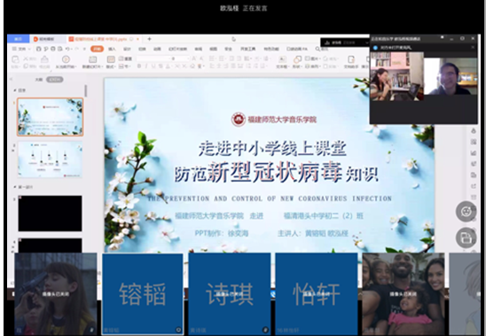 325-30日,授课学生深入漳州艺术实验学校、福清港头中学等省内多所中小学开展线上云课堂。直播课上,他们详细介绍国内外疫情现状,以及战“疫”中展示出的中国速度、中国力量、中国担当、中国精神,生动讲述防疫路上的一个个感人故事。同时,带领学生一起演唱由音乐学院学生创作的原创歌曲《等待花开的时候》。