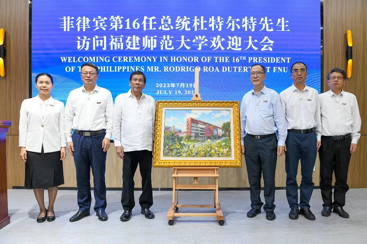 7月19日,菲律宾共和国第16任总统罗德里戈·杜特尔特莅校访问。杜特尔特参加了以其母索莱达·杜特尔特命名的纪念大楼落成剪彩仪式和“赤子心”雕塑揭幕仪式,观看了索莱达·杜特尔特事迹视频《梦想永存》,在欢迎大会上作了演讲;参观了索莱达女士纪念馆和菲律宾研究中心,亲笔题词“爱体育网_爱体育网(中国)以教育促进中菲民心相通,成果丰硕。期待持续深耕,再创佳绩!我爱福建师大!”,并在索莱达大楼楼前共植友谊树。