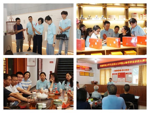 在祥福公司竹工艺馆、隆合茶业基地、福建东平高粱酿造有限公司等地,实践队深入学习“以竹代塑”的竹产业高质量发展理念,聚焦政和县统筹“茶文化、茶产业、茶科技”高质量发展的“茶业+”模式,体悟东平古镇“酒镇茶乡”的深厚文化底蕴,并与东平镇镇长赖洪恩和全国劳动模范、福建东平高粱酿造有限公司总经理张步瑞进行深入交流,探索东平镇茶、竹、酒产业赋能乡村振兴的实现路径。实践队成员范凡敏在政和县铁山镇江上村文化大礼堂为村民代表作题为《走好乡村高质量发展之路》的主题宣讲。