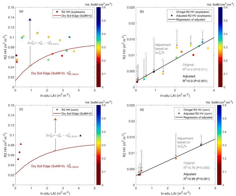 图注,(a)和(b)分别为消除土壤湿度影响前和后,大豆冠层微波信号与LAI的相关性有显著的提升;(c)和(d)为玉米冠层。