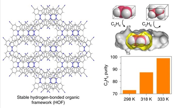 乙烯乙烷分离是一个目前重要且能源密集型的工业过程。张章静教授团队组装了一例由四氰基联咔唑经C–N•••H–C二重氢键连接而成的微孔氢键有机框架(HOF-FJU-1)。它的稳定性强,在水、强酸、强碱和一些极性有机溶剂等恶劣条件下都能保持稳定。它的结构刚柔并济,基于特有的温度调节的压力门控机制,对乙烯/乙烷表现出很高的吸附选择性。在60°C,接近于实际工业过程真实混合气的温度下,HOF-FJU-1实现了在固定床柱中生产高纯度乙烯。