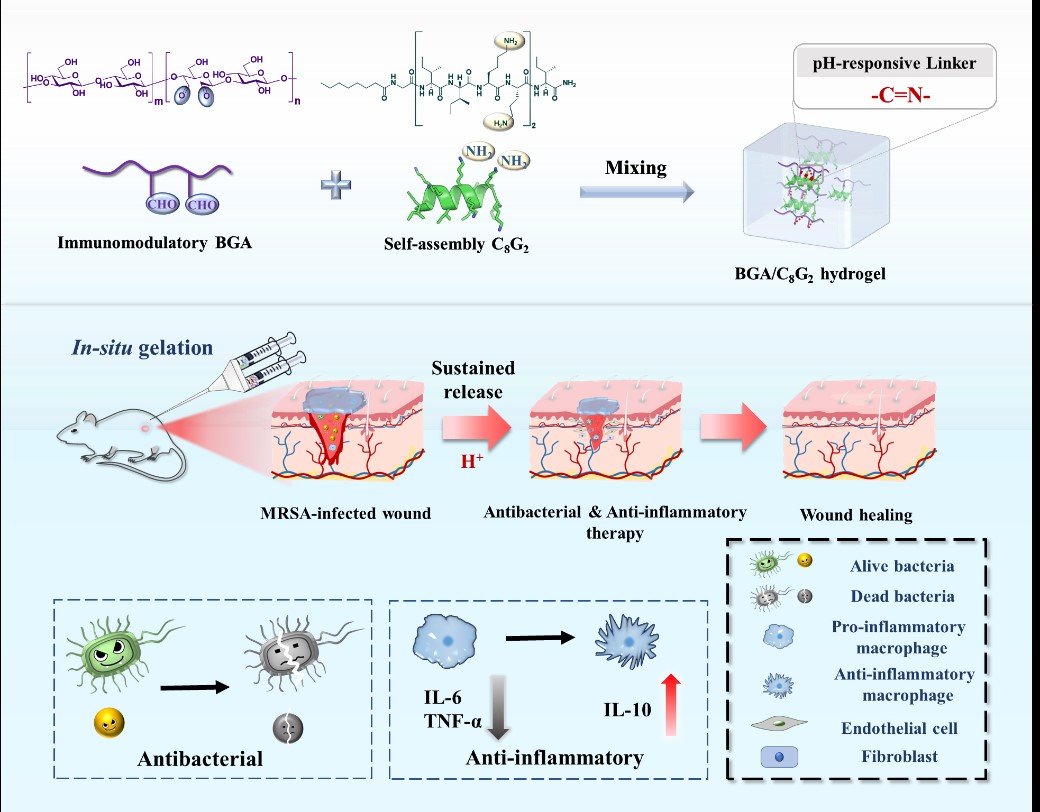 细菌感染和过度的炎症反应会阻碍伤口的愈合。水凝胶已成为治疗细菌感染伤口的理想敷料。然而,一些抗菌水凝胶制备较复杂、成本高昂,甚至需要红外等其它手段加以辅助发挥功效,因此不适用于常规的户外伤口处理。题为《无添加剂的多功能β-葡聚糖-肽水凝胶参与细菌感染伤口愈合的全过程》(An Additive-Free Multifunctional β-Glucan-Peptide Hydrogel Participates in the Whole Process of Bacterial-Infected Wound Healing)发表在医学TOP期刊Journal of Controlled Release上。这项研究工作报道了一种由氧化β-D-葡聚糖和两亲性抗菌肽构建的可原位生成的水凝胶,该水凝胶制备简便,通过两组分固有的抗菌活性和免疫调节活性加速细菌感染的伤口愈合。可逆亚胺键使水凝胶在伤口组织周围持续释放抗菌肽和具有炎症调节作用的β-D-葡聚糖,在抗菌的同时抑制过度炎症反应的发生,进而加速伤口愈合。同时水凝胶固有的湿性和网络结构使其具有止血和促进细胞迁移的能力。在耐甲氧西林金黄色葡萄球菌(MRSA)感染的全厚皮肤大鼠伤口模型中,该水凝胶表现出优异的抗菌、抗炎活性和促伤口愈合能力。该水凝胶在体内也可以抑制炎症因子的表达,并促进抗炎因子的产生,同时增强M2型巨噬细胞极化,并加速表皮组织再生。这些特点使这种水凝胶成为治疗多重耐药菌感染伤口的理想敷料。