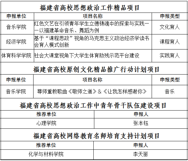 近日,中共福建省委教育工委公布2021年福建省高校思想政治工作有关培育建设项目入选名单,共遴选产生2021年福建省高校思想政治工作精品项目60项、原创文化精品推广行动计划20项、思想政治工作中青年骨干队伍建设项目5项和网络名师培育支持计划项目5项。爱体育网_爱体育网(中国)6个项目入选,立项总数居全省高校首位。[宣传部(文明办、新闻中心)]