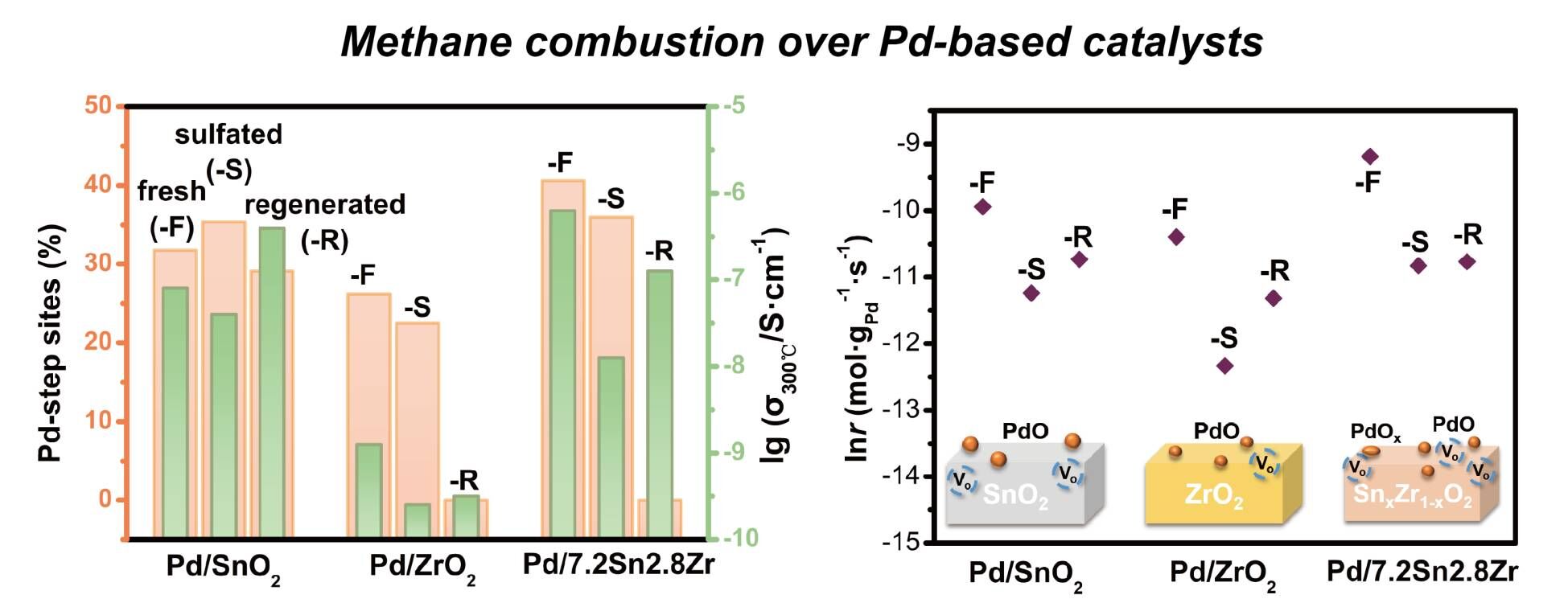 近日,在前期工作(ACS Appl. Mater. Interfaces, 2022, 14, 16233-16244;J. Cleaner Prod., 2023, 385: 135744)的基础上,取得重要进展,研究结果《Key factors for methane combustion over palladium-based catalysts revealed by enhanced and depressed catalytic performance》发表在《Applied Catalysis B: Environmental》。发现富锡和富锆的二元锡锆氧化物制备的负载钯催化剂,其低温活性、耐水性具有明显差异。以特定锡锆物质量比制备负载钯催化剂,锡锆固溶体的形成产生更多的氧空位,PdO物种的晶格氧活性高,其展现出优良的低温活性、热稳定性以及抗水性能。然而,含锆载体制备的催化剂经硫化和再生处理后,硫酸盐的生成会使得氧空位减少,抑制了PdO与晶格氧、气相氧的氧交换,钯粒子易于烧结。而纯锡载体催化剂与硫相互作用较弱,再生性能好。通过调变载体组成,获得了氧移动性好、耐硫性能高、高效稳定的钯基催化剂。