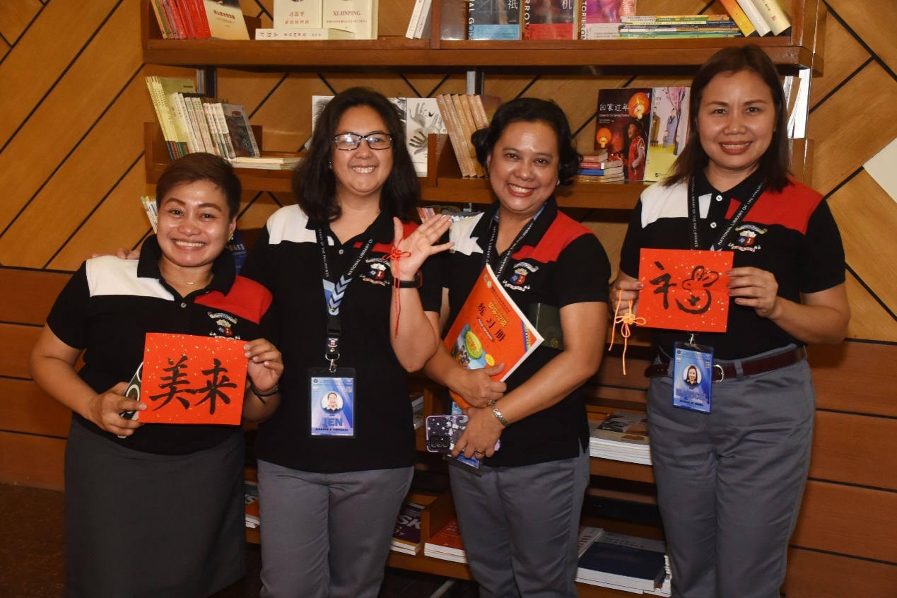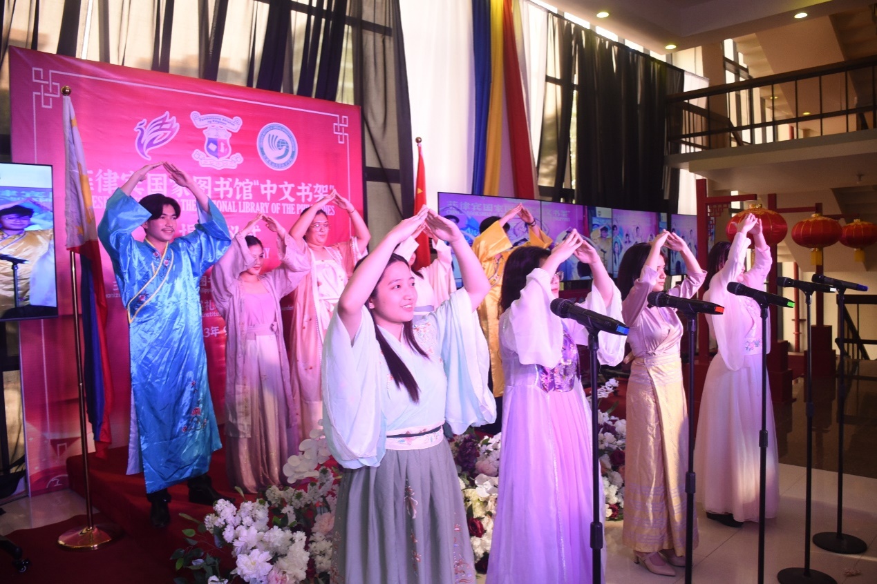 北京语言大学出版社向菲律宾国家图书馆捐赠图书200余册,到场嘉宾共同为“中文书架”揭幕。随后,现场领导和嘉宾共同参观了《100个热词了解新时代中国》图片展,以及红溪礼示大学孔子学院志愿者教师们准备的书法、中国结等文化体验活动。