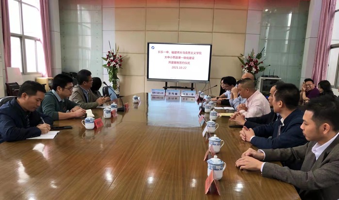 近日,马克思主义学院与长乐一中举行“大中小学思政课一体化建设共建基地”签约仪式,搭建大学、中学思政课一体化理论与实践研究平台。长乐区委教育工委副书记王庆享,长乐一中校长郑其强、党委书记潘云朋,马克思主义学院党委书记张爱民、副书记叶龙祥、思政系主任刘国皇,及长乐一中高中部全体思政课教师参加了仪式。