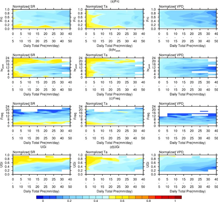 图1 各类气象因子随日总降雨量和降雨日变化特征的变化情况,气象因子包括短波辐射(SR,左列)、气温(Ta,第二列)和大气水汽亏缺(VPD,右列),降雨日变化特征包括(a)白天降水比例(Frc),(b)降水极值时刻(hrpeak),(c)白天降水频率(Freq)和(d)日内降水分布不均衡性(UGi)。