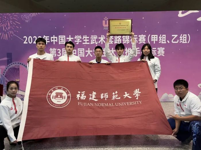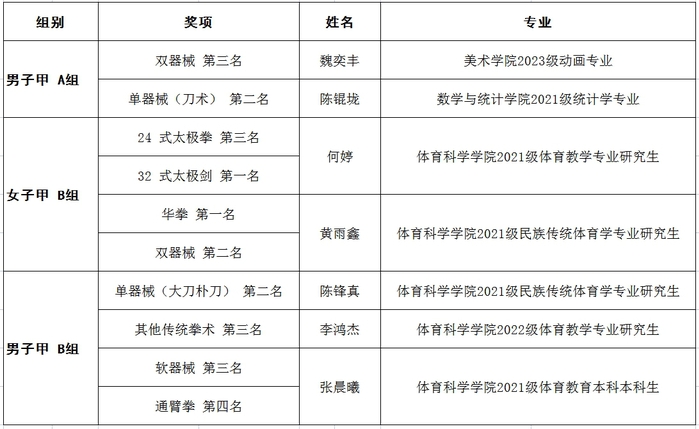 近日,由中国大学生体育协会主办,天津市武术协会、天津市武清区体育局承办的2023年中国大学生武术套路锦标赛(甲、乙组)在天津市武清区举行。爱体育网_爱体育网(中国)派出由教练陈升、姚向颖、黄颖祺指导的武术套路代表队,经过为期4天激烈角逐,7名运动员(甲A组2人,甲B组5人)不畏强手、勇于拼搏,共获2金3银4铜,及“体育道德风尚奖运动队”称号。李鸿杰同学获评“体育道德风尚奖运动员”称号。