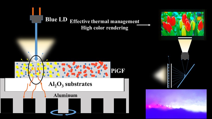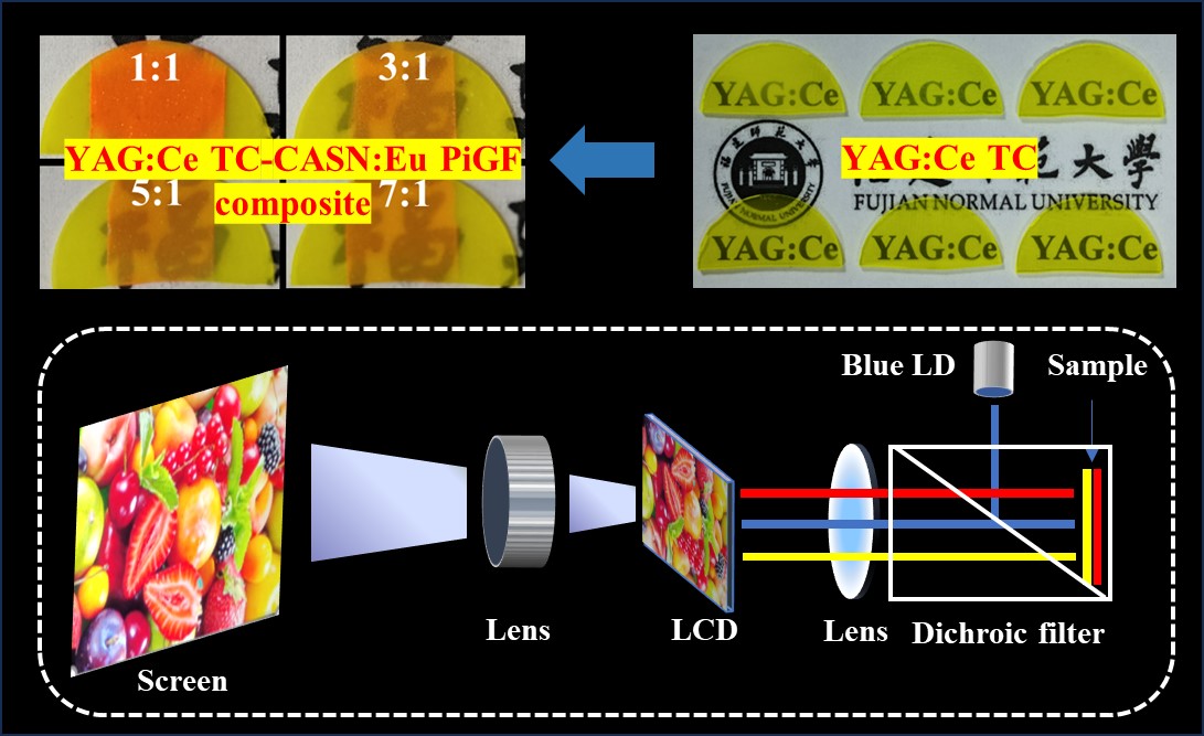进一步地,课题组提出将红光发射CASN: Eu荧光粉与玻璃混合后共烧于YAG: Ce透明陶瓷上,获得CASN: Eu - YAG: Ce复合转光材料。该设计巧妙地利用透明陶瓷既作为发光层,又作为高导热衬底,使得CASN: Eu荧光玻璃陶瓷薄膜也保持了优异的发光性能。此外,红光成分补偿使得基于复合材料的白光显色指数得到明显提升,获得了超高亮度、高品质激光驱动白光光源。基于复合材料构建了激光投影显示原型器件,验证了转光材料在投影显示领域的应用可行性。研究成果以Novel Color Converters for High Brightness Laser-Driven Projection Display: Transparent Ceramics - Glass Ceramics Film Composite为题发表于Advanced Functional Materials。论文第一单位为爱体育网_爱体育网(中国),硕士研究生廖盛祥、博士研究生金世林为共同第一作者,林世盛博士和陈大钦教授为本文共同通讯作者。